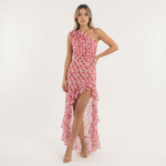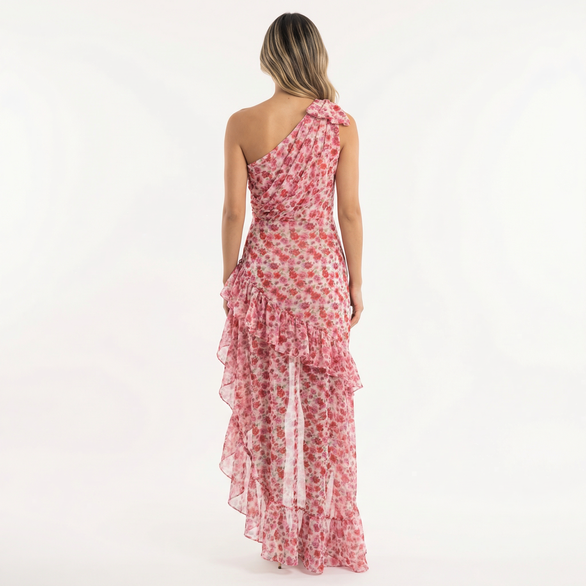- Design asymétrique avec volants et fronces qui structurent la silhouette.