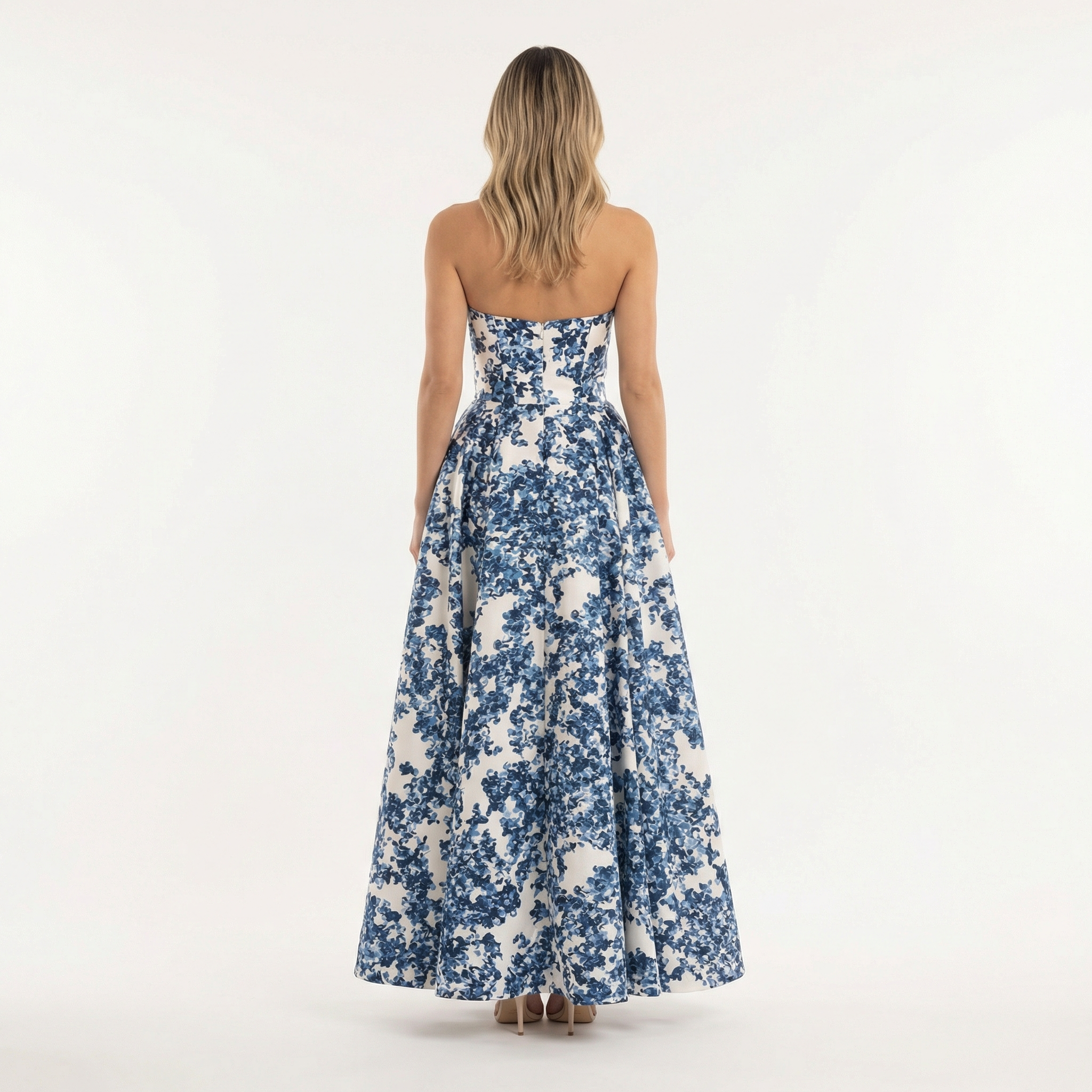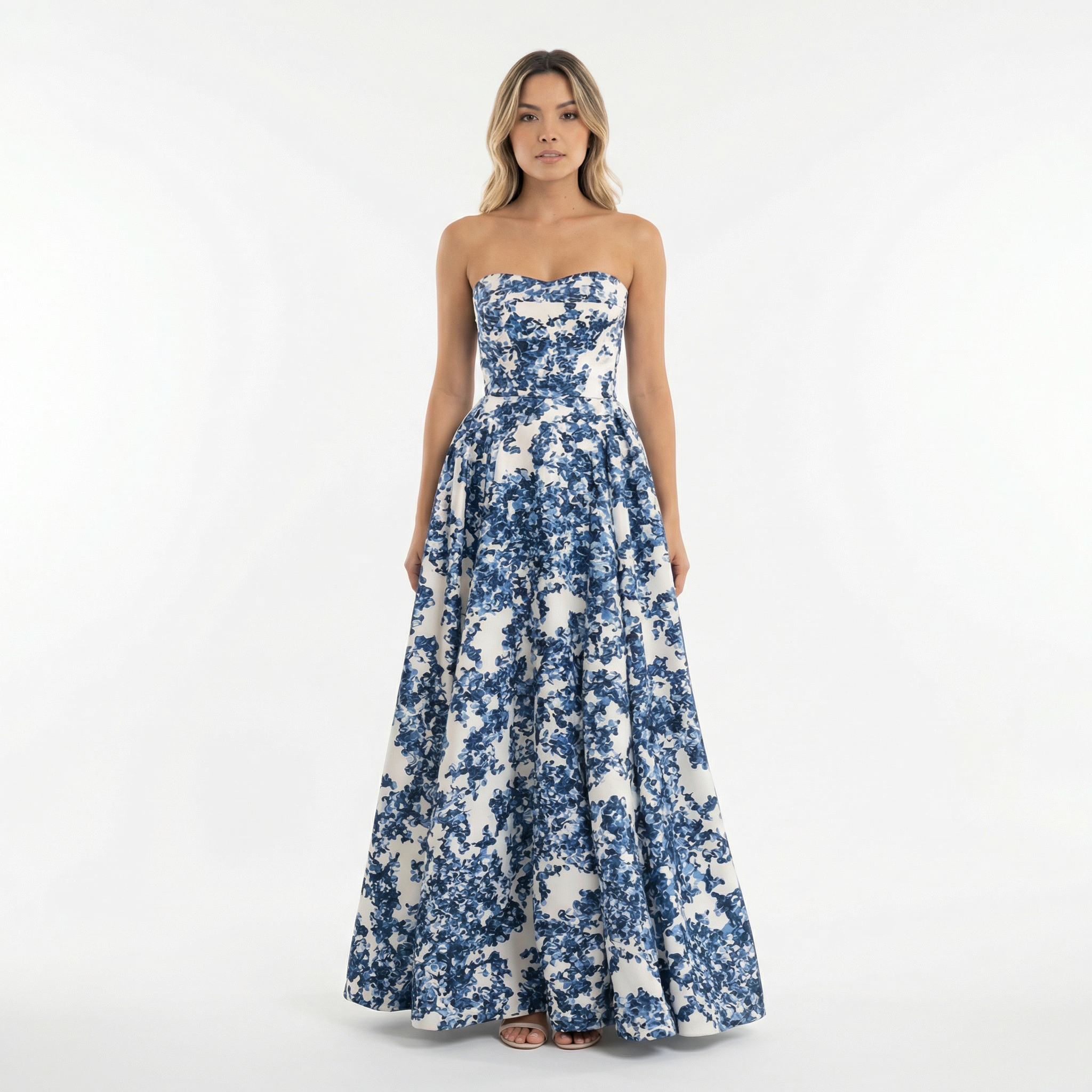 Cette robe longue est conçue pour les occasions spéciales, offrant une silhouette raffinée et féminine. Son décolleté cœur et sa jupe ample en font un choix idéal pour les événements formels, tout en répondant aux tendances actuelles de la mode.