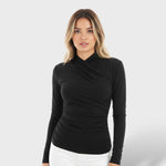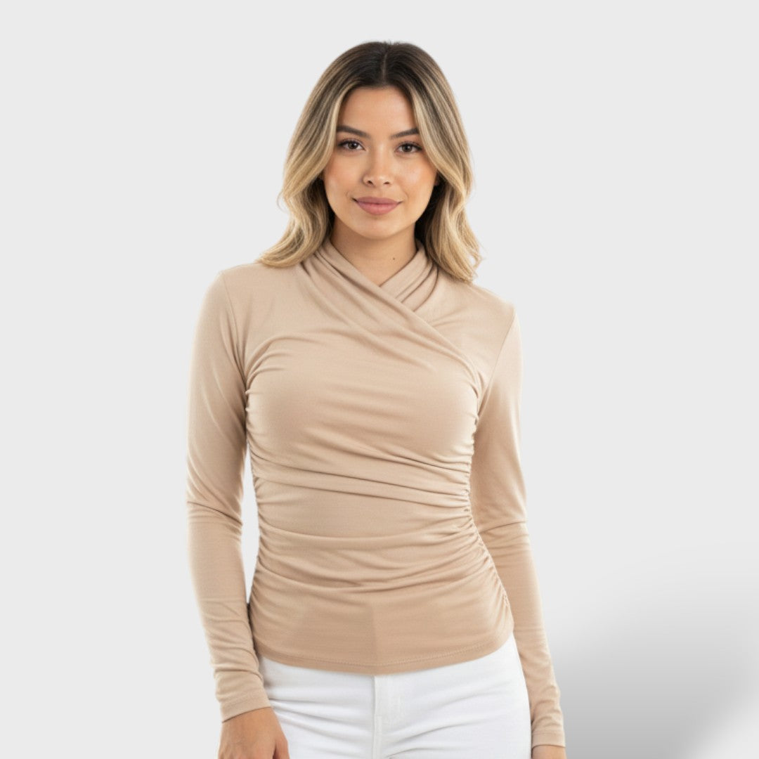 Ce haut à manches longues présente une silhouette ajustée qui flatte la forme du corps. Avec un design croisé à l'avant, il offre une allure élégante et moderne, idéal pour des tenues de jour comme de nuit.