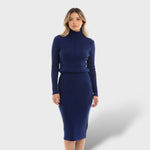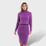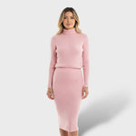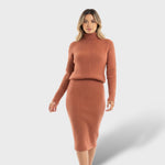 Cet ensemble en tricot allie style et confort pour la mi-saison. Le pull col montant et la jupe ajustée créent une silhouette féminine adaptée à diverses occasions, allant du bureau aux sorties décontractées.